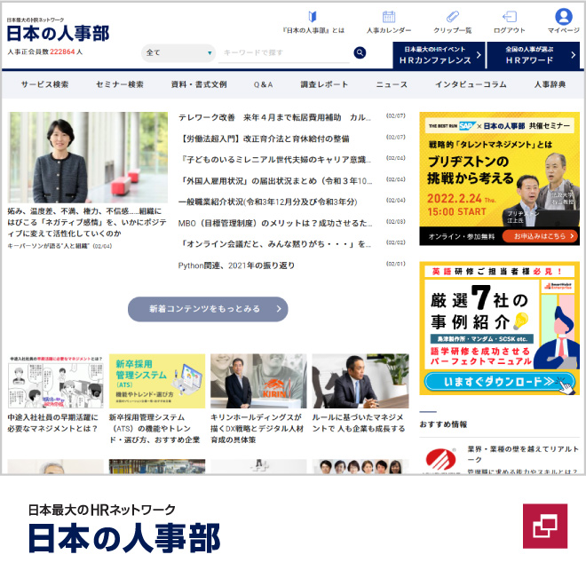 『日本の人事部』Webサイトでは、皆さまの課題解決を支援するため、雇用、配置、評価、育成、制度、労務、福利厚生など、人事、人材開発に関するさまざまな情報を発信し、HR領域の変革を支援しています。