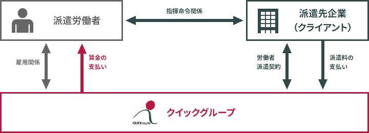 人材派遣を行うに当たっては、当社グループが運営する登録サイトやインターネット広告等を通じて、派遣での就業を希望する求職者を広く募集し、ご登録いただきます。このご登録者の中から、企業の依頼内容にマッチした人材を選び、企業との間に労働者派遣契約を締結するとともに、ご登録者との間でも期間を定めた雇用契約を締結した上で、企業へ人材を派遣しています。