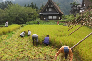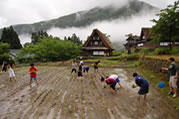 クイックグループでは毎年、この「平村研修所」にて新入社員研修を行っているほか、集落に住む方々とともに、春には研修所の大掃除や障子張り、棚田での田植え、秋には稲刈りや合掌造りには欠かすことのできない屋根用の茅刈りを行うなどし、世界文化遺産の保護・保存に協力しております。