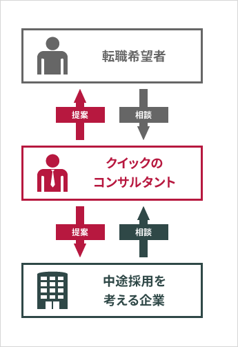 - 人材紹介事業では、クイック独自の一気通貫システムを採用しています。業界専門のコンサルタントが企業・転職希望者の双方を担当することで、一般的なサービスよりも踏み込んだ、精度の高いマッチングを行う、というものです。高度な専門知識や現場感が求められるような場面でも、業界および企業と転職希望者それぞれをよく知るコンサルタントがご支援を行うことで、企業様と転職希望者様双方にとってベストなソリューションを実現します。