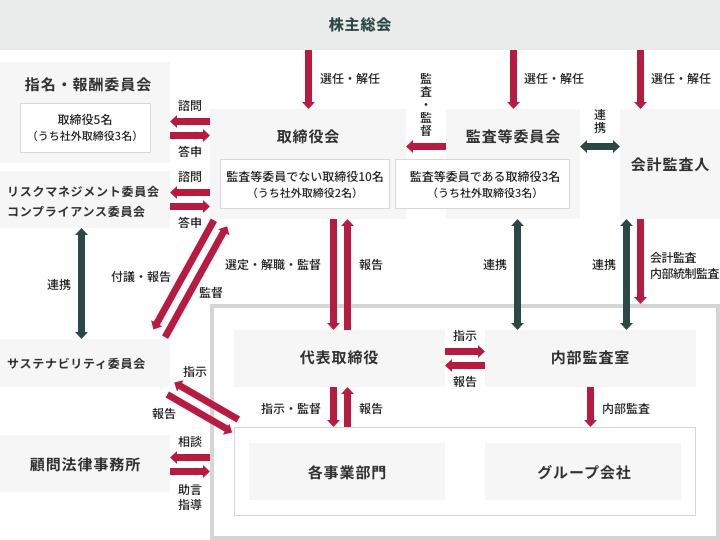 このような監査体制のもと、監査等委員は会計監査人及び内部監査部門と定期的にミーティングを行い、監査計画及び監査結果等について情報交換ならびに意見交換を行うなど連携を図り、効率的な監査を実施することで、監査等委員監査の実効性を確保してまいります。