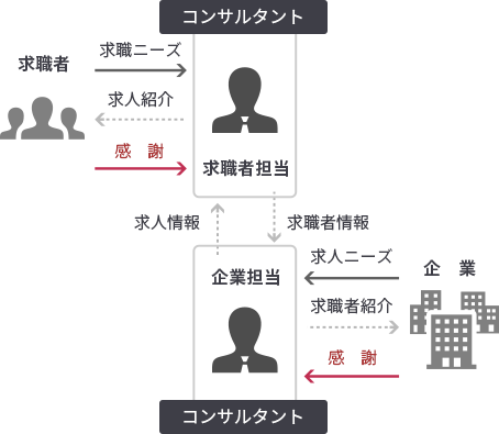 企業担当と求職者担当に分かれている
